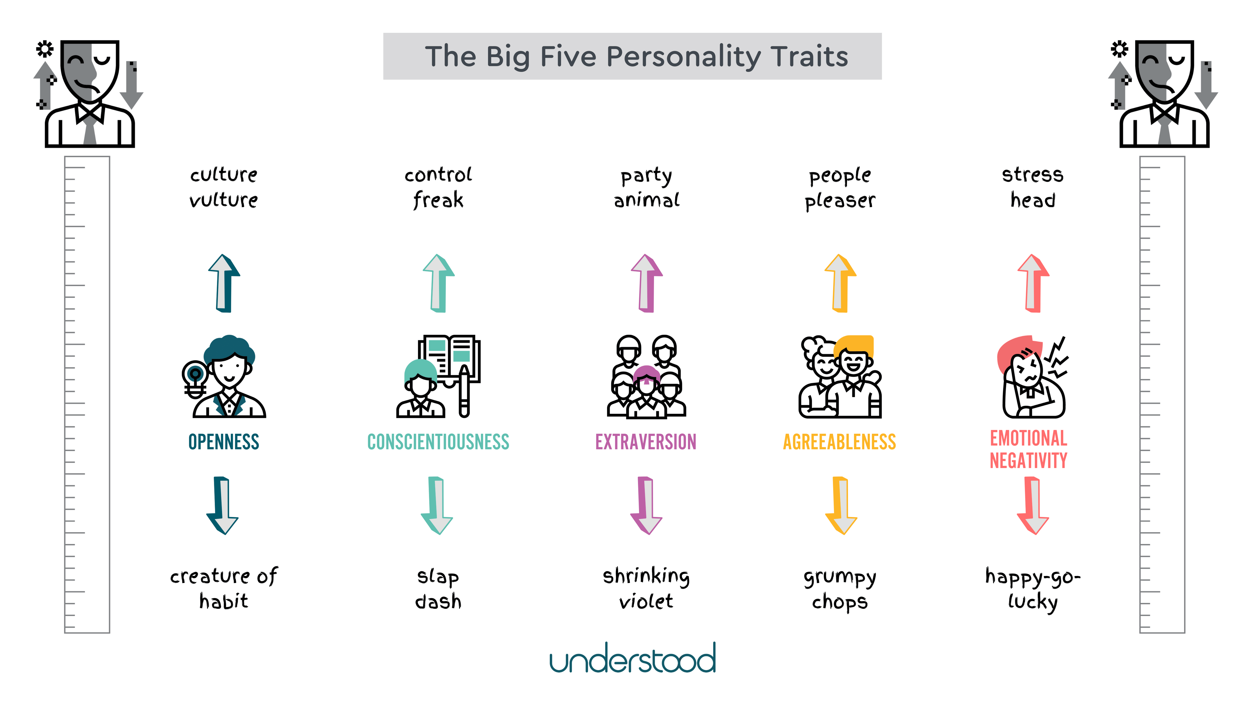 At Understood, we believe that the Big Five is a more insightful way of measuring personality. These five major traits cover the diverse ways we differ: Openness, Conscientiousness, Extraversion, Agreeableness and Emotional Negativity.