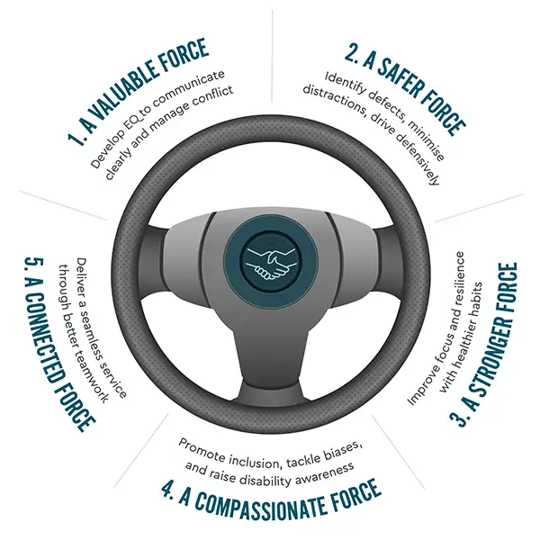 The Driving Force CPC Programme is a comprehensive and customisable programme of five CPC courses designed for bus drivers. It covers a range of essential topics, including communication, emotional intelligence, safety, and customer service. Drivers develop skills in areas like behavioural safety, health and wellbeing, diversity and inclusion, and customer experience, all aimed at improving both personal and professional performance on the road.